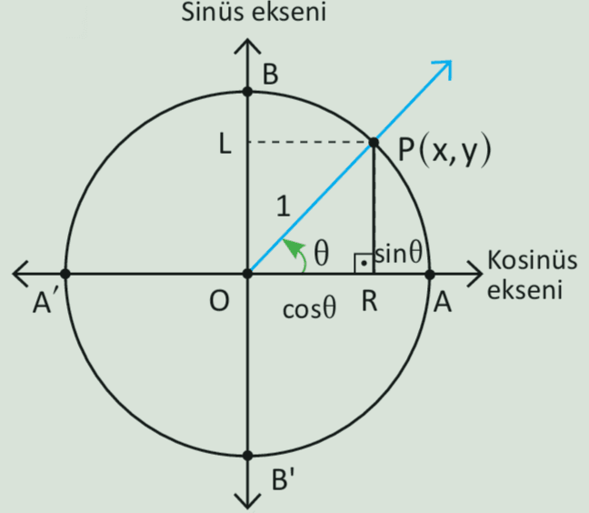Birim çember üzerinde pozitif yönlü bir \( \alpha \) açısının bitim kolunun çemberi kestiği nokta \( P(x, y) \) olsun. Bu noktanın koordinatları, bize o açının kosinüs ve sinüs değerlerini verir.