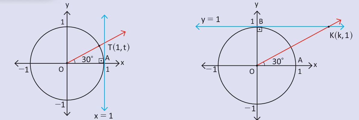 Sinüs ve kosinüs gibi, tanjant ve kotanjant da birim çember yardımıyla tanımlanır. Bunun için birim çembere teğet olan iki özel doğrudan faydalanırız: