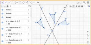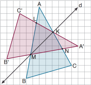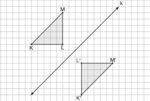 Her bir köşe noktası (A, B, C) için d doğrusuna olan dik uzaklığını belirleyelim ve bu uzaklıkta doğrunun diğer tarafına doğru noktaları (A’, B’, C’) işaretleyelim. Bu noktaları birleştirerek A’B’C’ üçgenini elde ederiz. Bu yeni üçgenin kenar uzunlukları ve açıları orijinal üçgenle aynı olacaktır. Örneğin, d doğrusu üzerinde bir K noktası varsa, K noktasının görüntüsü yine K noktasıdır.