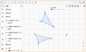 Her bir köşe noktasını (A, B, C) D noktasına olan uzaklığını koruyarak ve D noktası etrafında saat yönünde \(90^\circ\) çevirerek yeni konumlarına (A’, B’, C’) taşırız. Bu yeni noktaları birleştirerek A’B’C’ üçgenini elde ederiz. Bu üçgenin kenar uzunlukları ve açıları orijinal üçgenle aynı olacaktır.