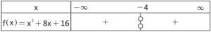 \(f(x) > 0\) (pozitif) olan yerleri arıyoruz. Tabloya göre ifade \(-4\) dışında her yerde pozitiftir. \(x = -4\) için ifade 0’a eşittir, bu da \(>0\) koşulunu sağlamaz.