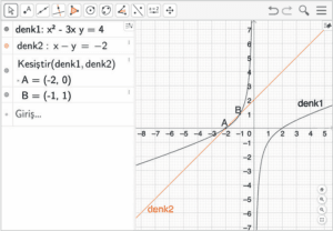 Bu denklem sisteminin çözümü, \(x^2 – 3xy = 4\) denkleminin grafiği ile \(x – y = -2\) doğrusunun grafiğinin kesiştiği noktaları temsil eder. Bulduğumuz \((-1, 1)\) ve \((-2, 0)\) noktaları, bu iki grafiğin kesim noktalarıdır.