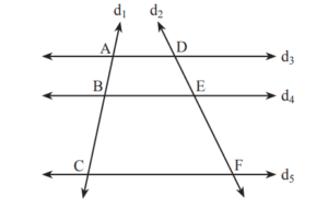 Birbirine paralel \( d_3, d_4, d_5 \) doğruları, \( d_1 \) ve \( d_2 \) doğruları tarafından kesildiğinde, oluşan doğru parçaları arasında aşağıdaki orantı geçerlidir: