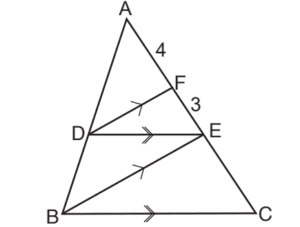 Bir ABC üçgeninde F, E noktaları AC kenarı üzerinde; D noktası AB kenarı üzerindedir. [DF] // [BE] ve [DE] // [BC] olarak verilmiştir. Ayrıca, \( |\text{AF}| = 4 \) cm ve \( |\text{FE}| = 3 \) cm’dir. Buna göre \( |\text{EC}| \) uzunluğunun kaç cm olduğunu bulunuz.