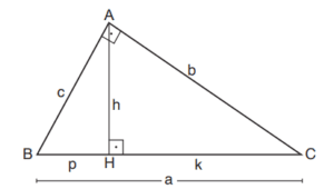 Bir dik üçgende, dik köşeden hipotenüse indirilen yükseklik (h) ile ayrılan parçaların (p ve k) ve dik kenarların (c ve b) hipotenüs (a) ile ilişkileri aşağıdaki gibi ifade edilir: