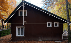 Bir evin çatısı dik üçgen şeklinde tasarlanmıştır. Bu ABC dik üçgeninde, dik kenarlar AB ve AC birbirine dik, AD yüksekliği hipotenüs BC’ye diktir. \( |\text{BD}| = 1.8 \) m ve \( |\text{DC}| = 5 \) m olarak verilmiştir.