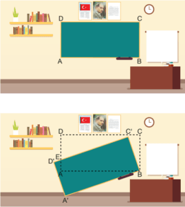A’ noktası yerdeki A köşesidir. A’B’C’D’ dikdörtgeni, ABC’D’ dikdörtgeninin B noktası etrafında dönmüş halidir. Dolayısıyla, \( |\text{A’B}| = |\text{AB}| = 240 \) cm ve \( |\text{C’B}| = |\text{CB}| = 120 \) cm’dir.