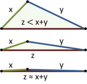 \[ |b – c| < a < b + c \] \[ |a – c| < b < a + c \] \[ |a – b| < c < a + b \]