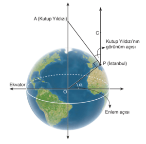 Dünya üzerindeki bir yerin Ekvator’a uzaklığının açısal değeri enlemdir. Kuzey yarım kürede Kutup Yıldızı’nın görünüm açısının ölçüsü, bulunulan enlem derecesini verir. Bir görselde Kutup Yıldızı’nın bulunduğu yer A noktası ile modellenmiş ve İstanbul’dan görünüm açısı 41° olarak verilmiştir. Ayrıca, görselde bazı paralel ve dik doğru parçaları bulunmaktadır. [OA] // [PC] ve [OA] ⊥ [OB] olduğu belirtilmiştir.