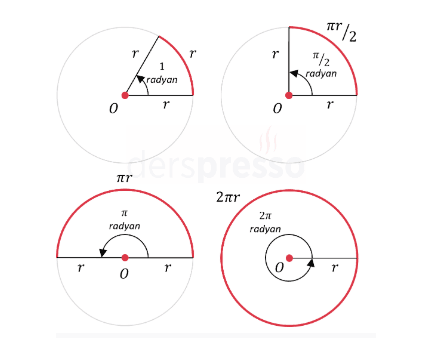 Tam bir açının \(360^\circ\) ve aynı zamanda \(2\pi\) radyan olduğunu öğrendik. Bu eşitliği kullanarak derece ve radyan arasında dönüşüm yapabiliriz.