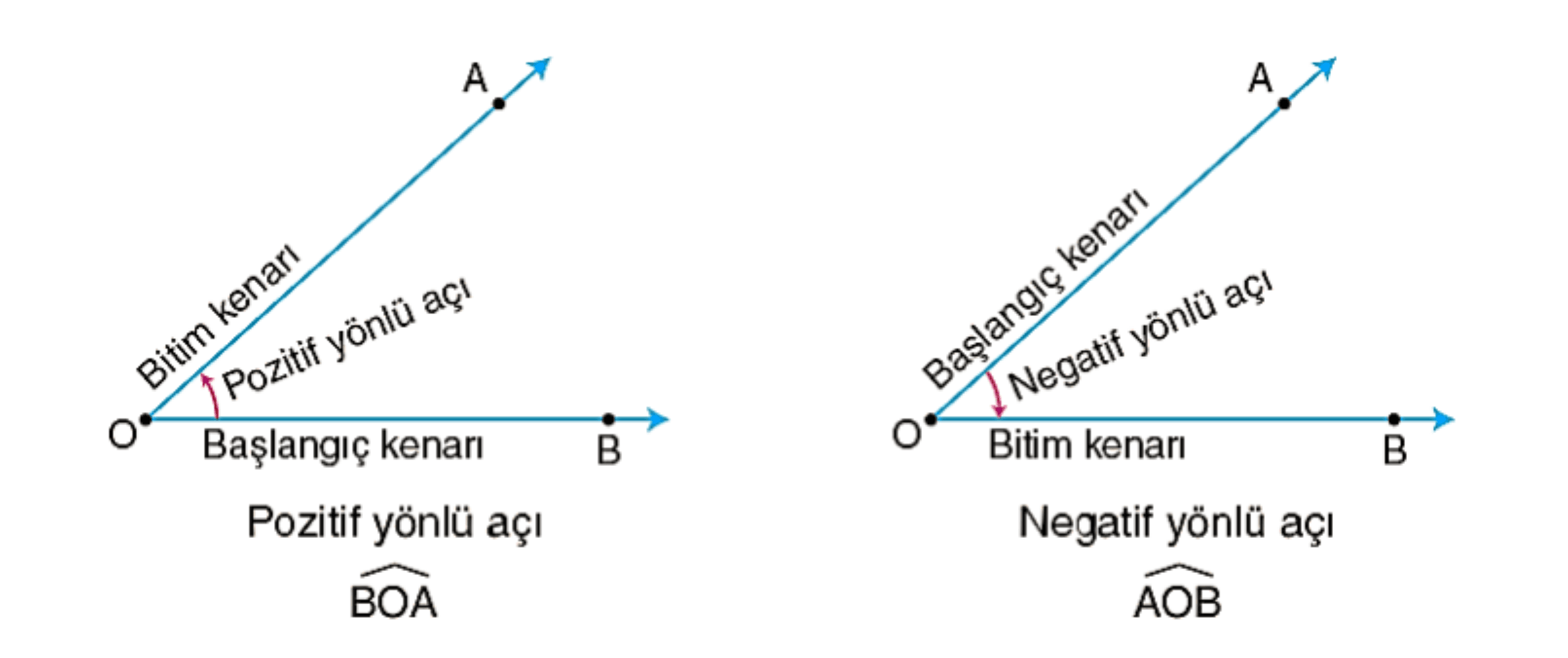 Şimdiye kadar açıyı iki ışının kesişimi olarak öğrendik. Artık bu tanımı bir adım öteye taşıyoruz. Yönlü açıda, ışınlardan birini başlangıç kenarı, diğerini ise bitim kenarı olarak kabul ederiz. Açının yönü, başlangıç kenarından bitim kenarına doğru yapılan dönme hareketine göre belirlenir.